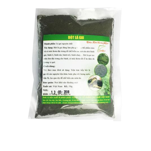 Bột bánh gai 50g là sản phẩm được sản xuất từ 100% lá gai tươi nguyên chất - nguồn nguyên liệu tự trồng và được sản xuất theo quy trình khép kín, đảm bảo an toàn, chất lượng. Bột màu xanh đen do chứa nhiều sắt; không pha trộn, không sử dụng chất bảo quản, giữ được mùi thơm nguyên chất của lá gai tươi.
